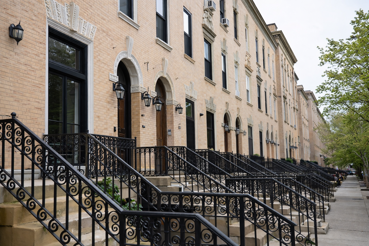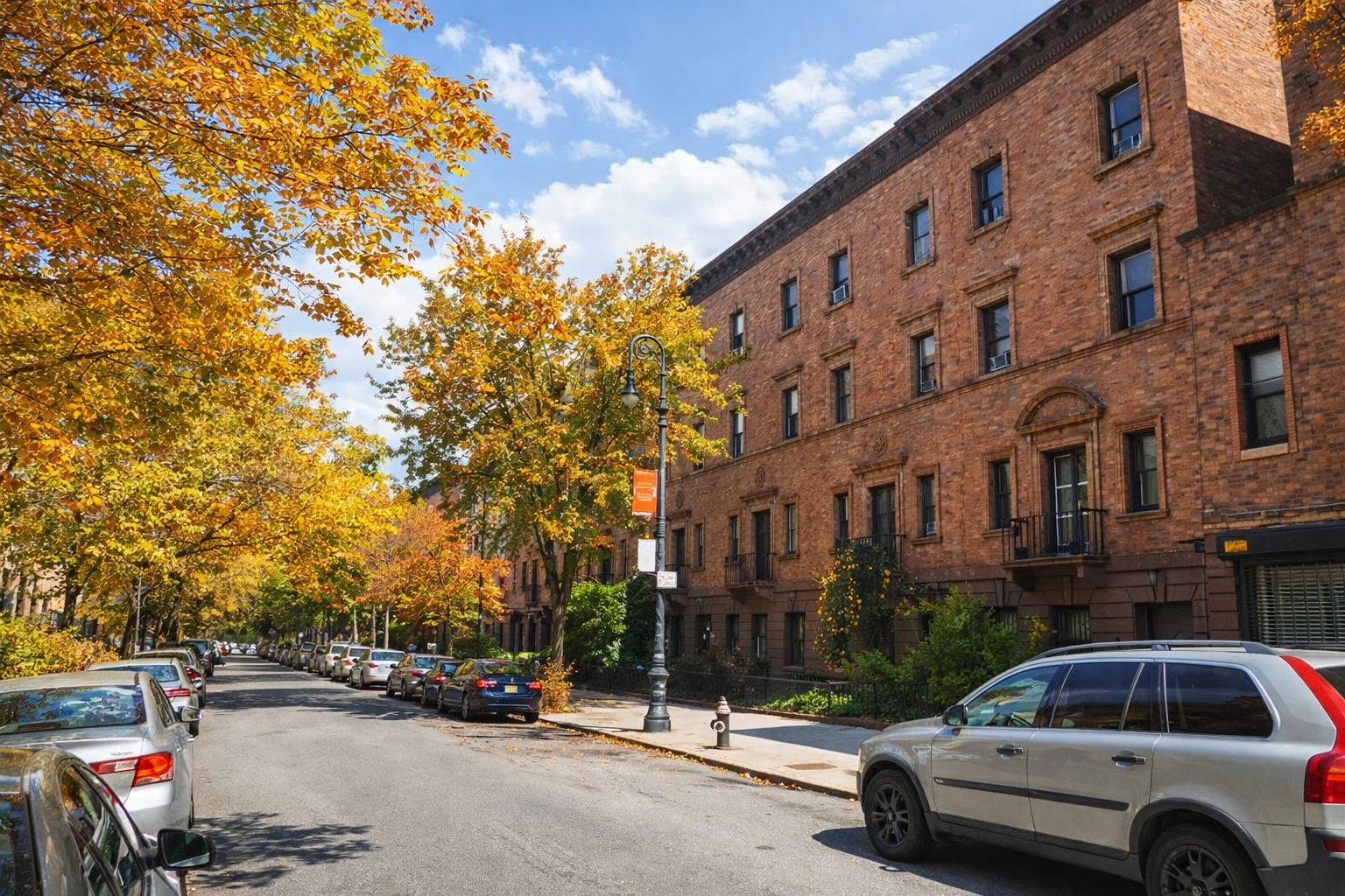See this iconic row of late-19th-century homes, famous for their porches and front gardens, showcasing a unique architectural contrast within Harlem’s historic streetscape.